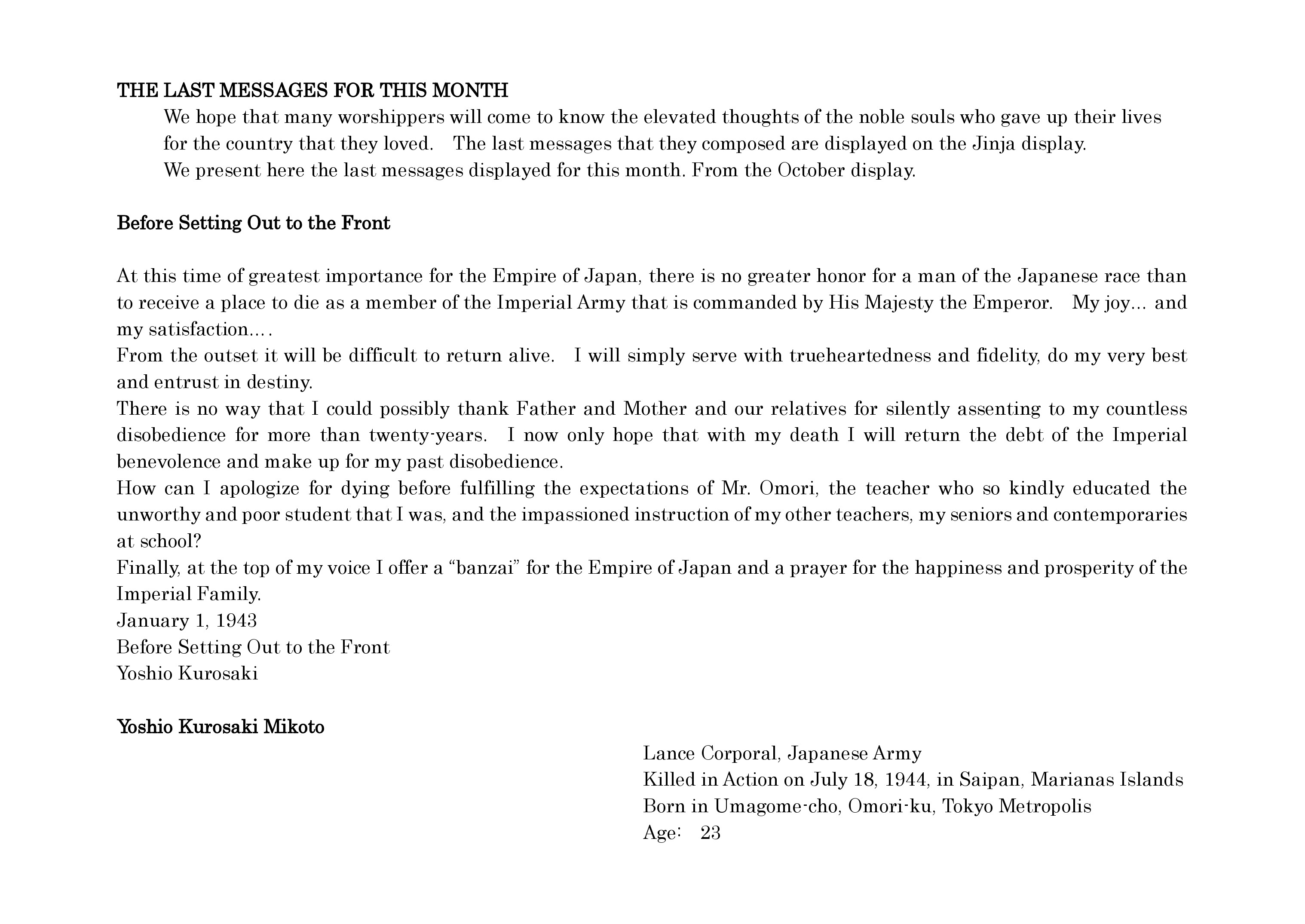 Last Messages for This MonthWe hope that many worshippers will come to know the thoughts of the noble souls who gave up their lives for the country they loved. The last messages that they composed are displayed at the front of the shrine. We present here the last messages selected for this month.