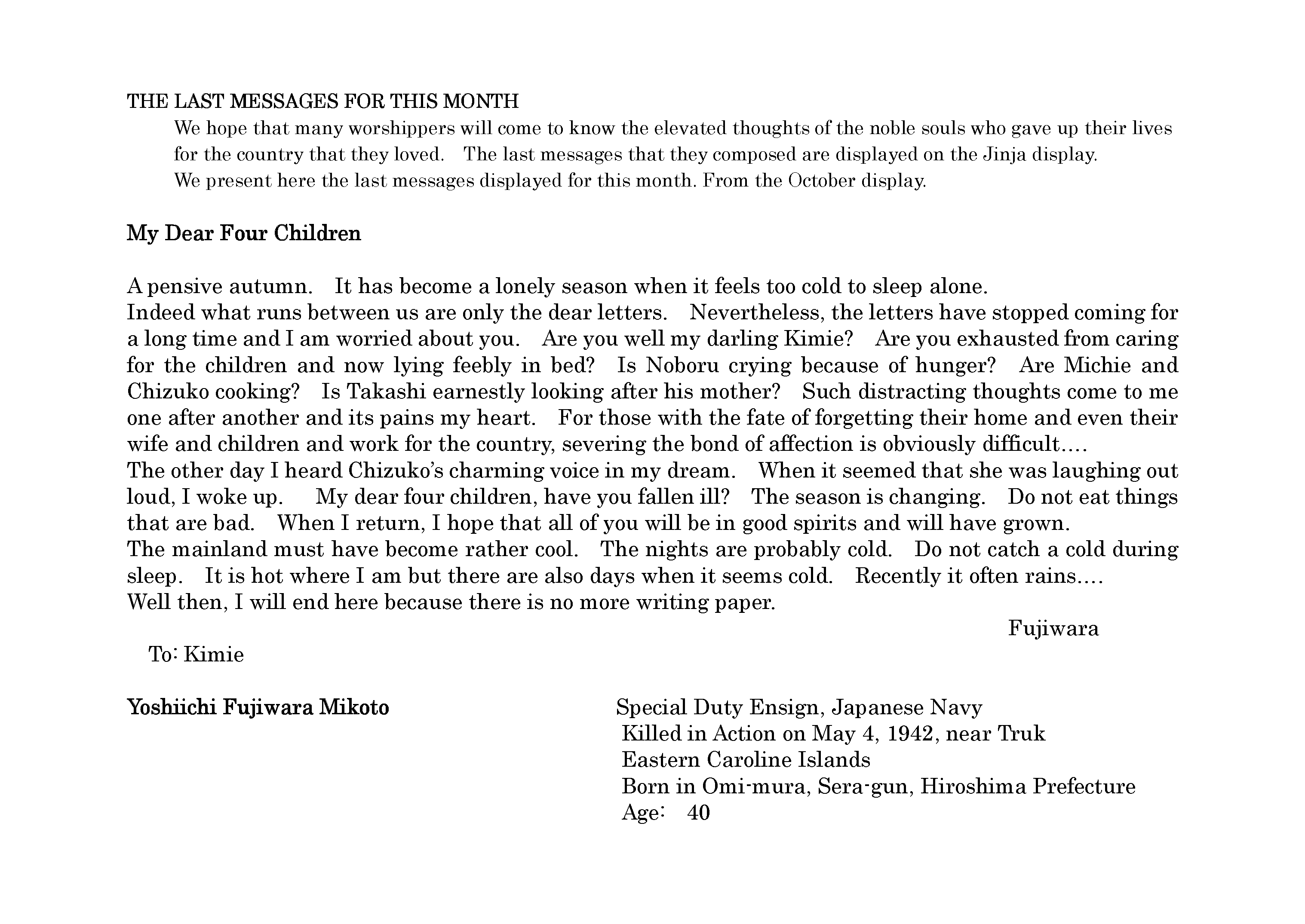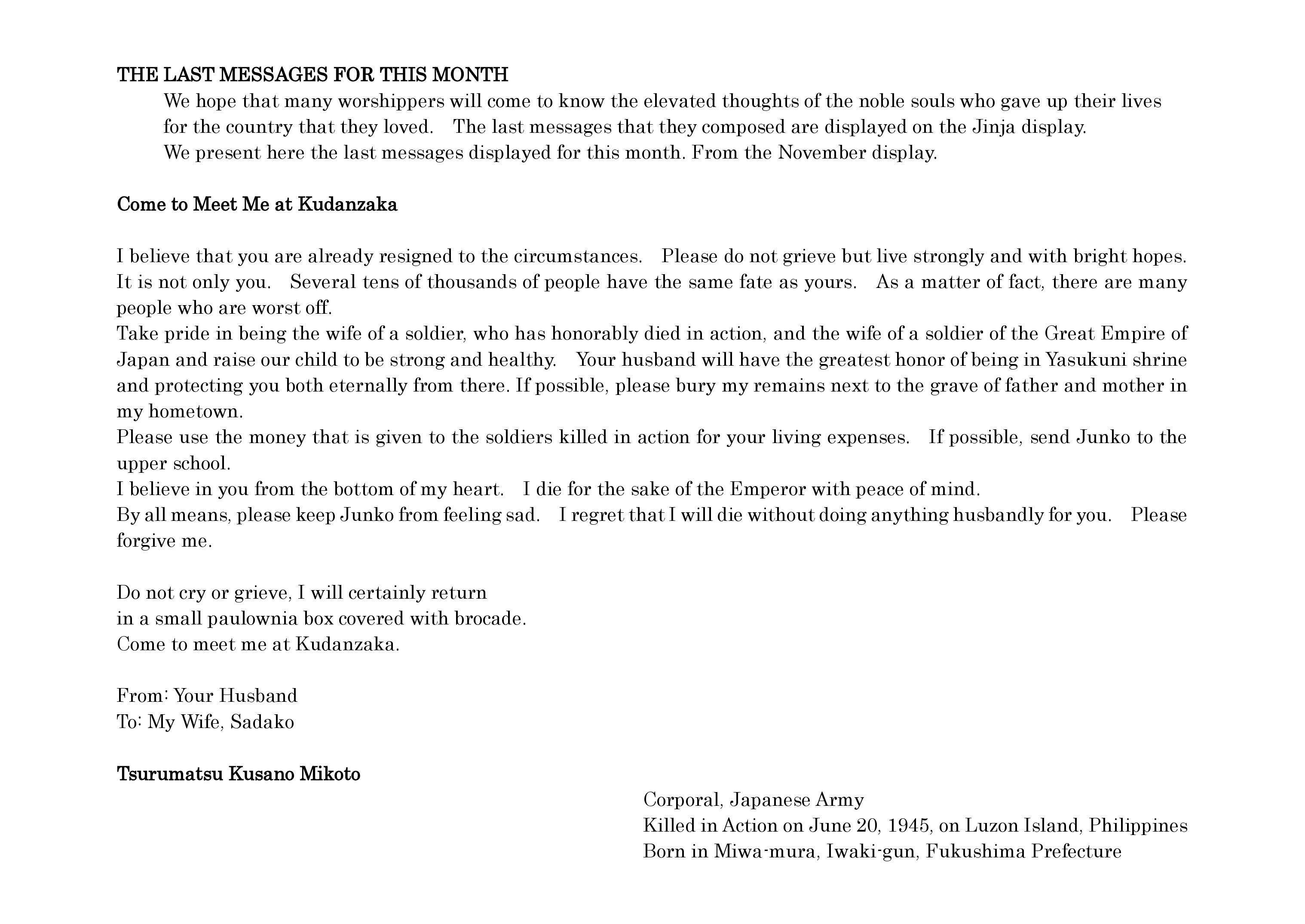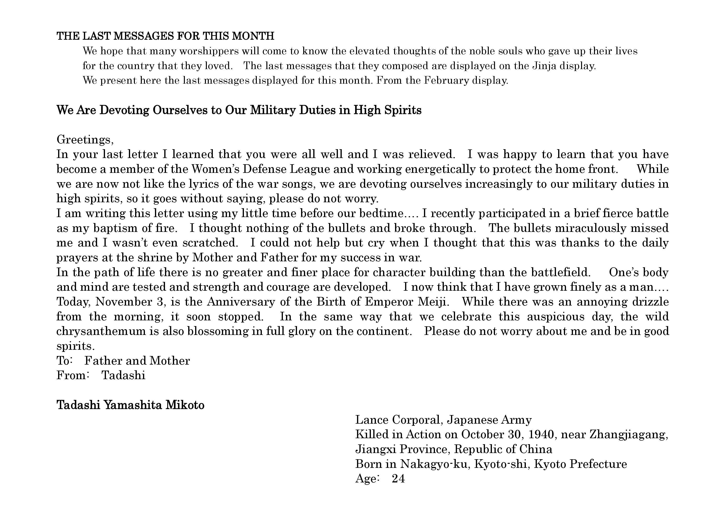 We hope that many worshippers will come to know the thoughts of the noble souls who gave up their lives for the country they loved. The last messages that they composed are displayed at the front of the shrine. We present here the last messages selected for this month.