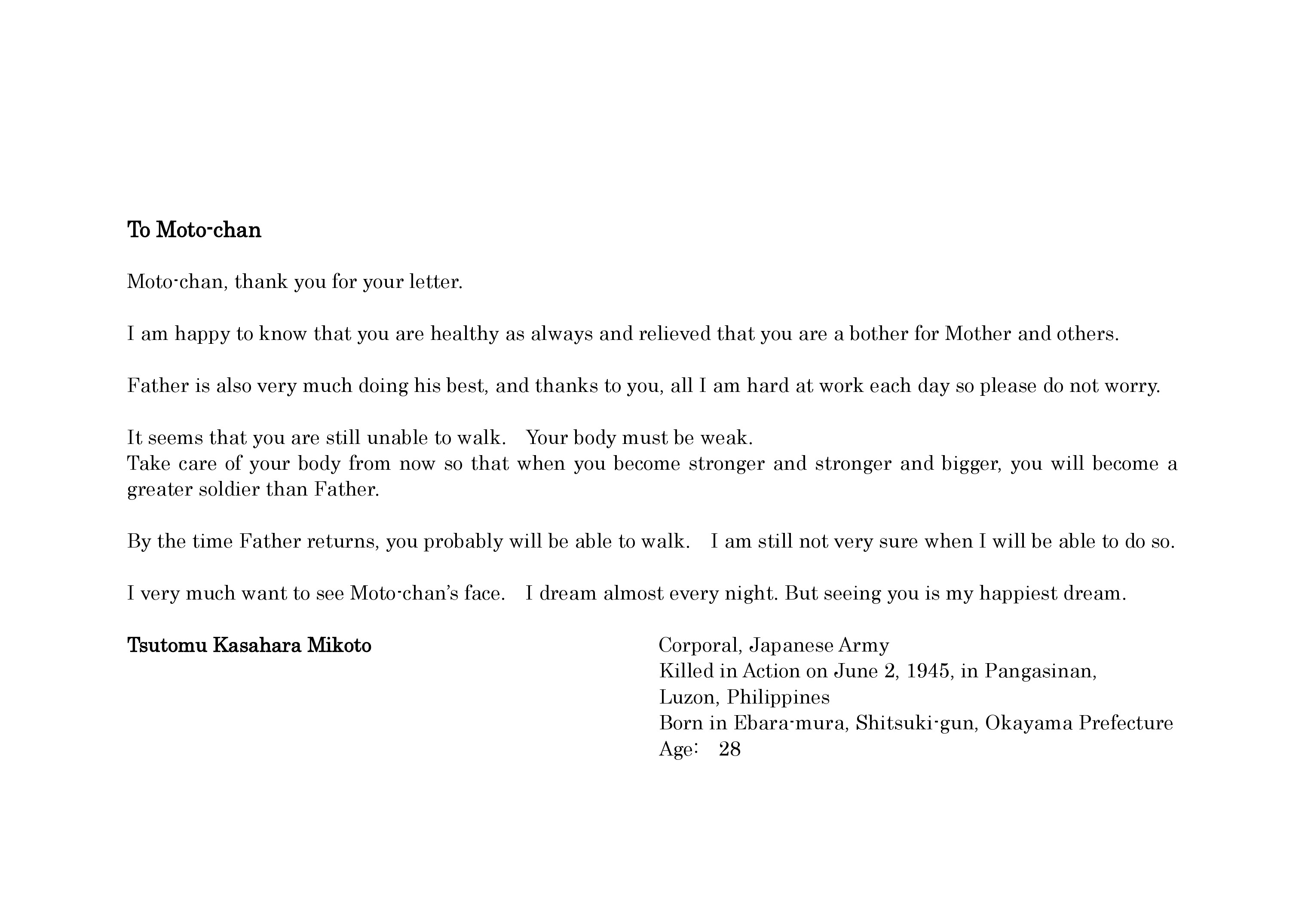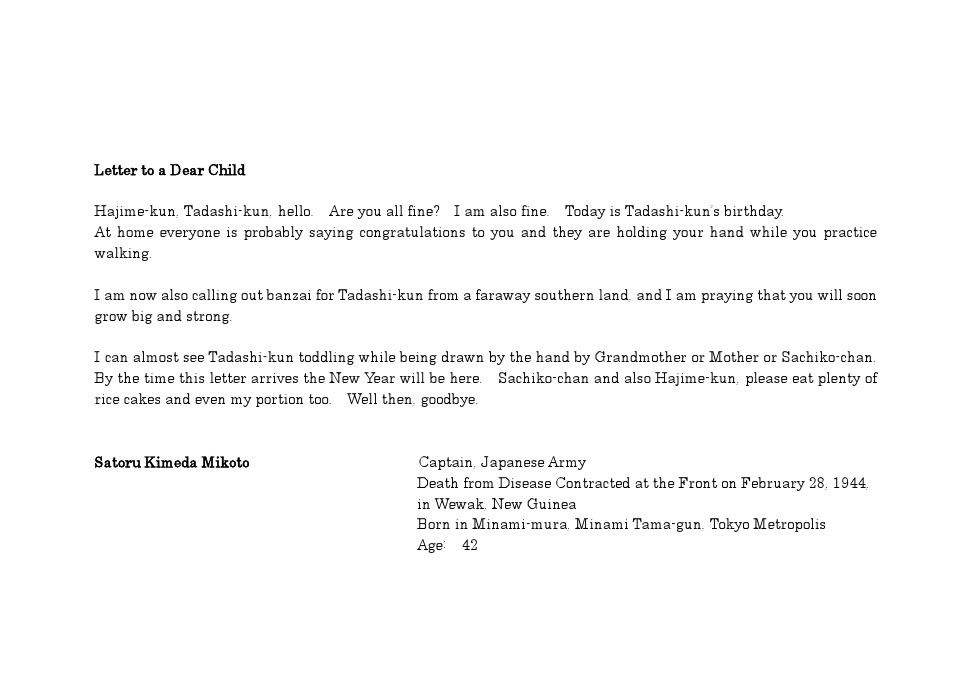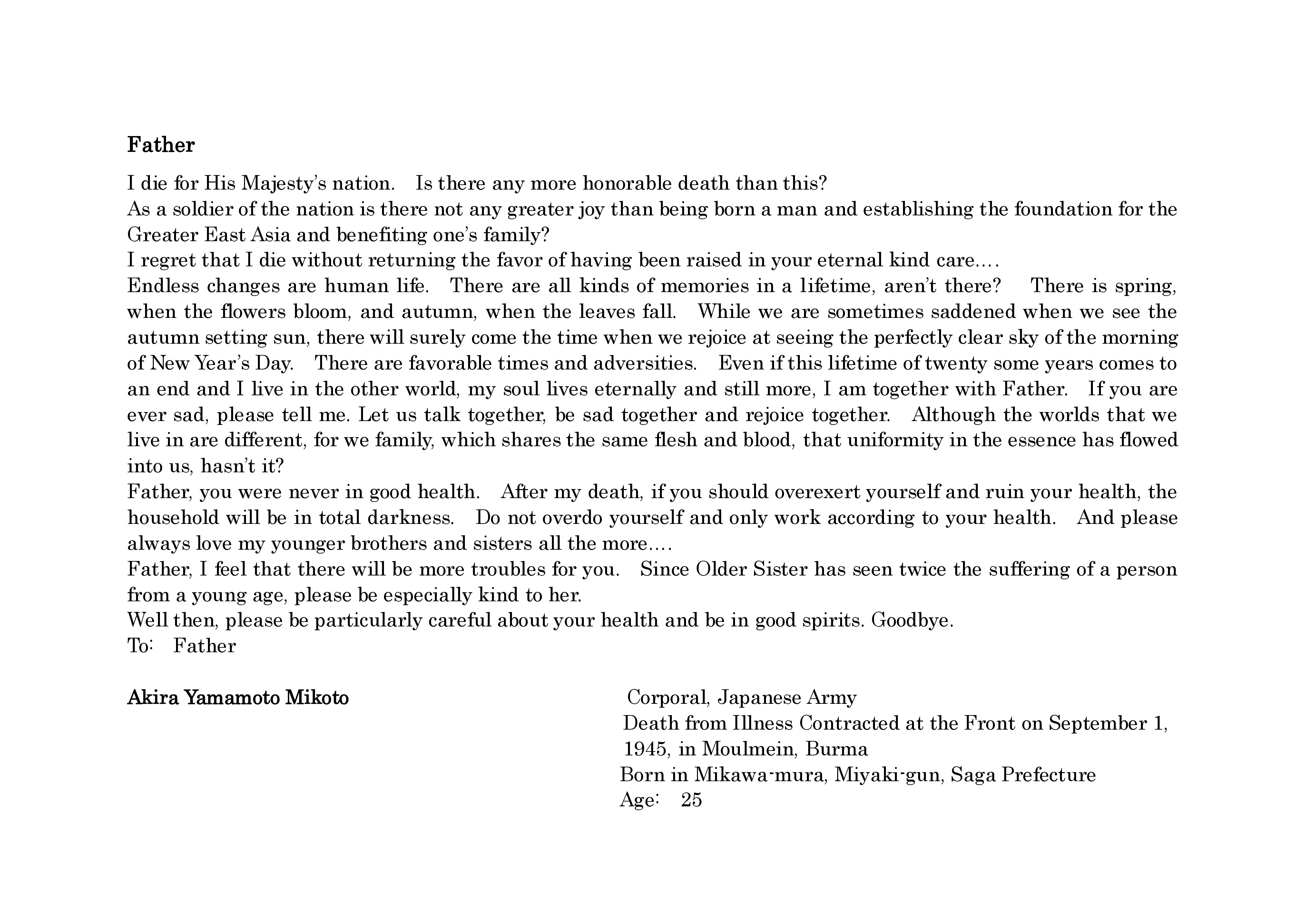 We hope that many worshippers will come to know the thoughts of the noble souls who gave up their lives for the country they loved. The last messages that they composed are displayed at the front of the shrine. We present here the last messages selected for this month.