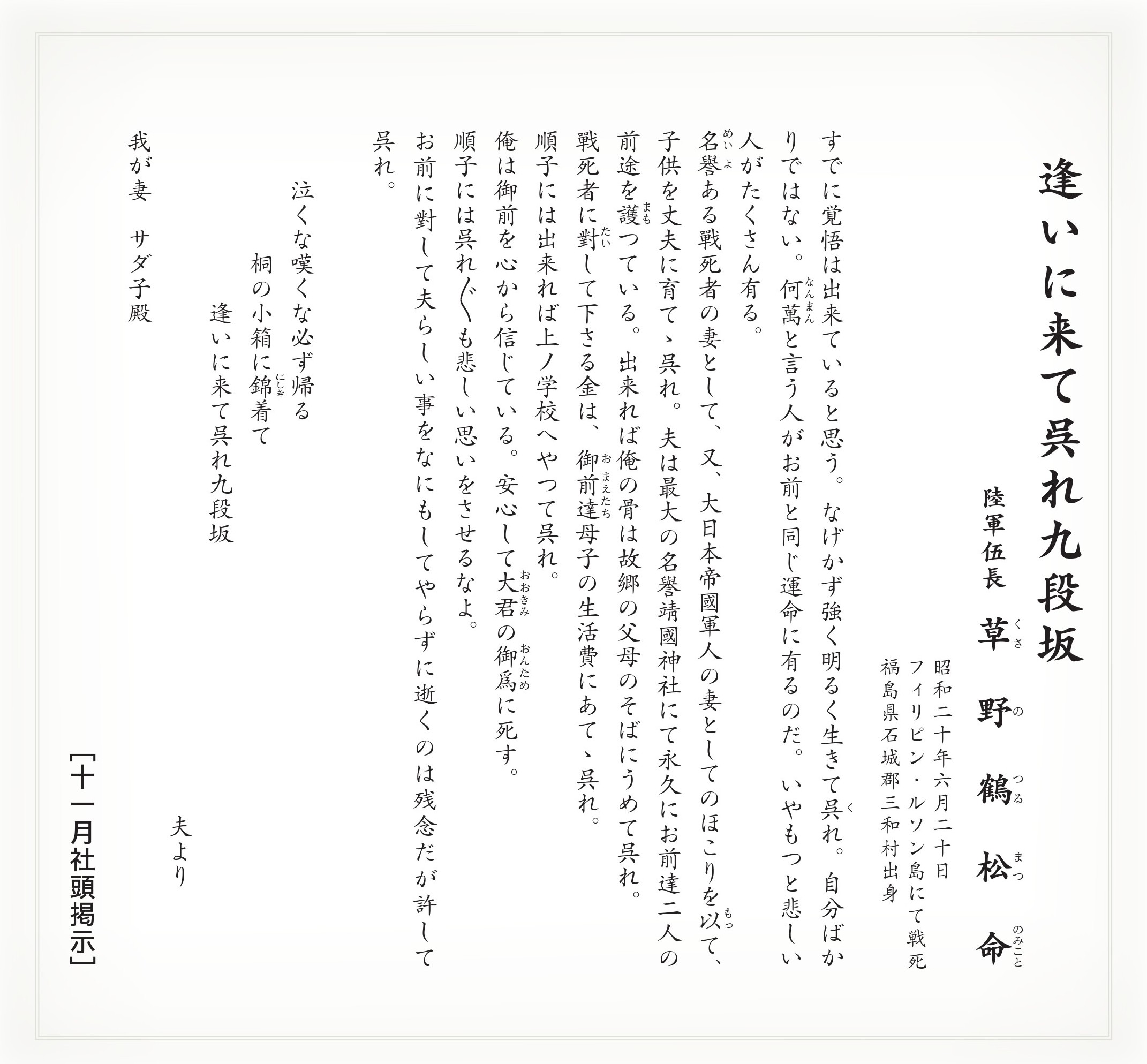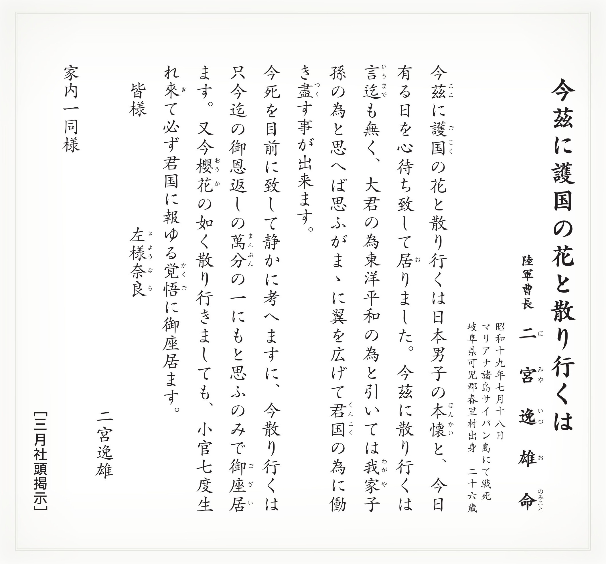 これまで掲示した遺書や書簡は、書籍『英霊の言乃葉』に纏めて刊行、頒布していますので、是非ご覧下さい。