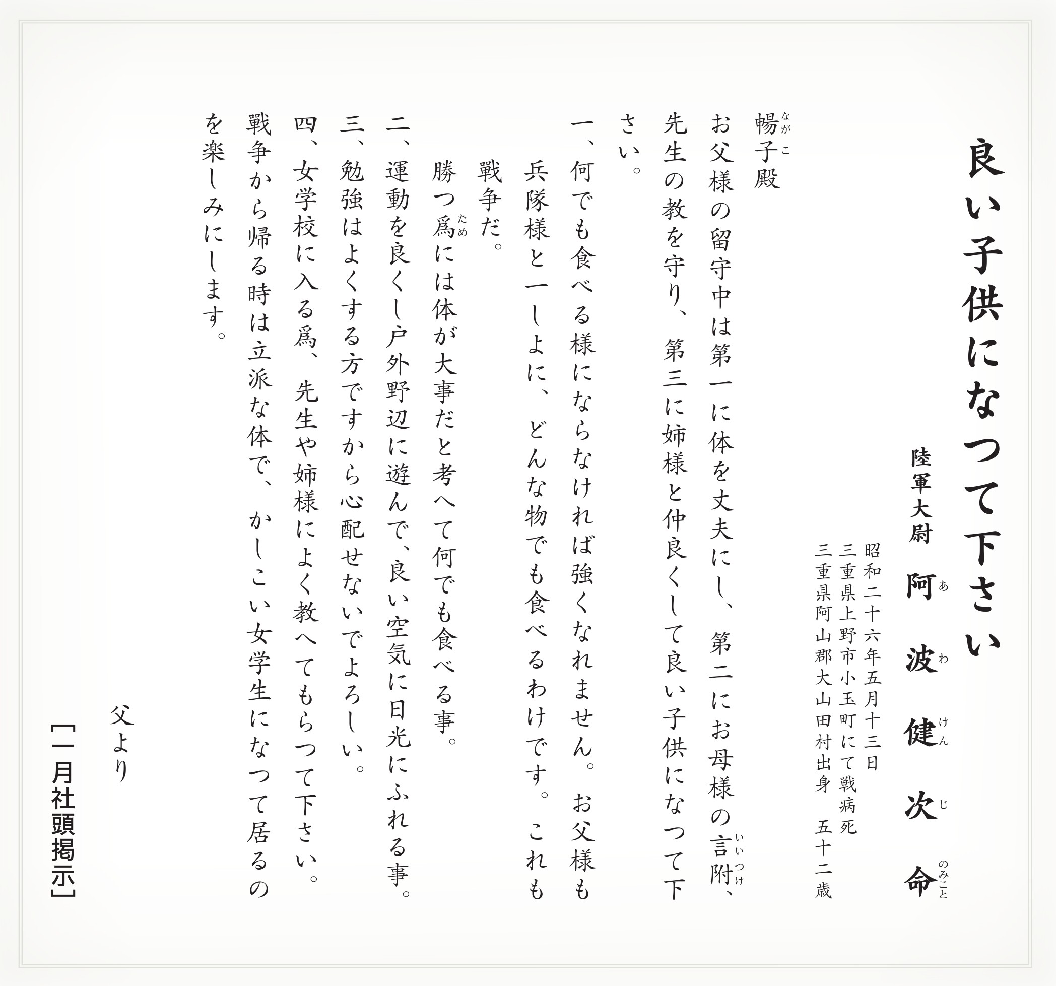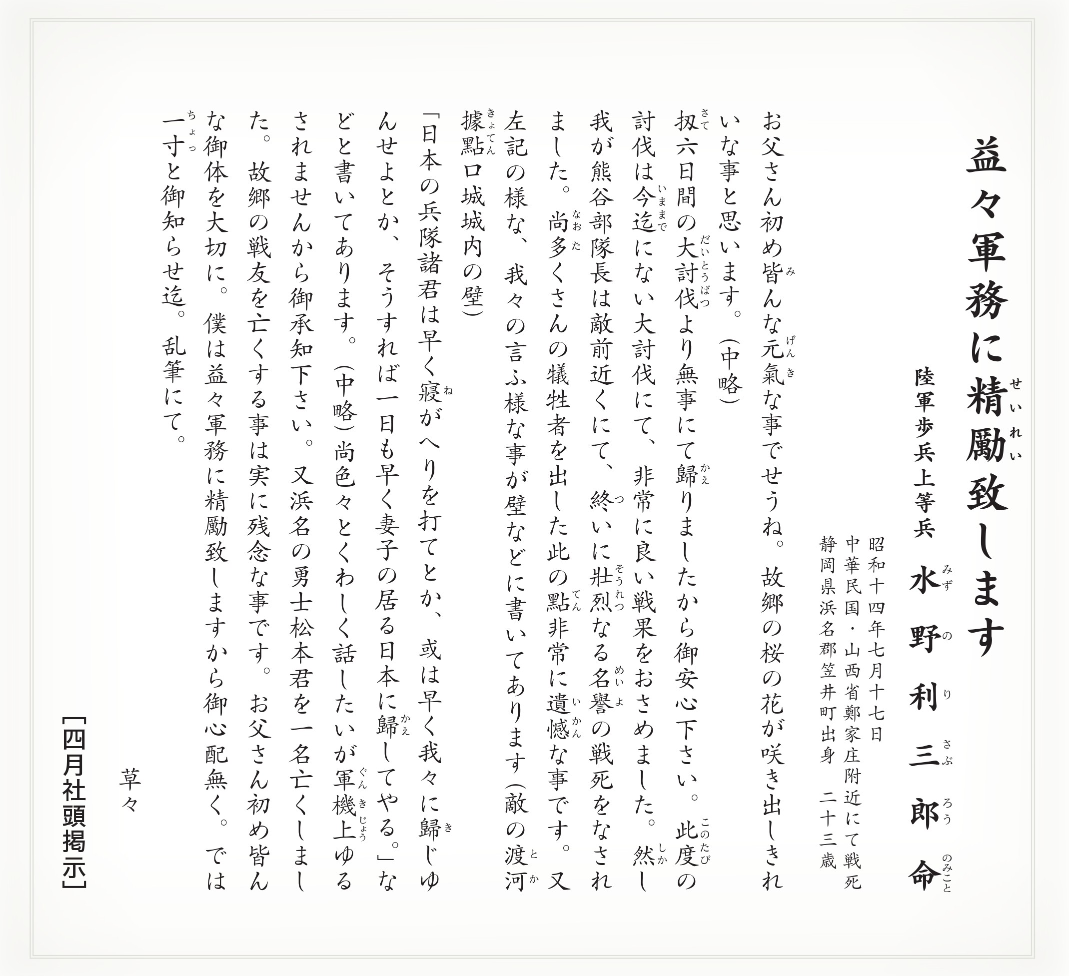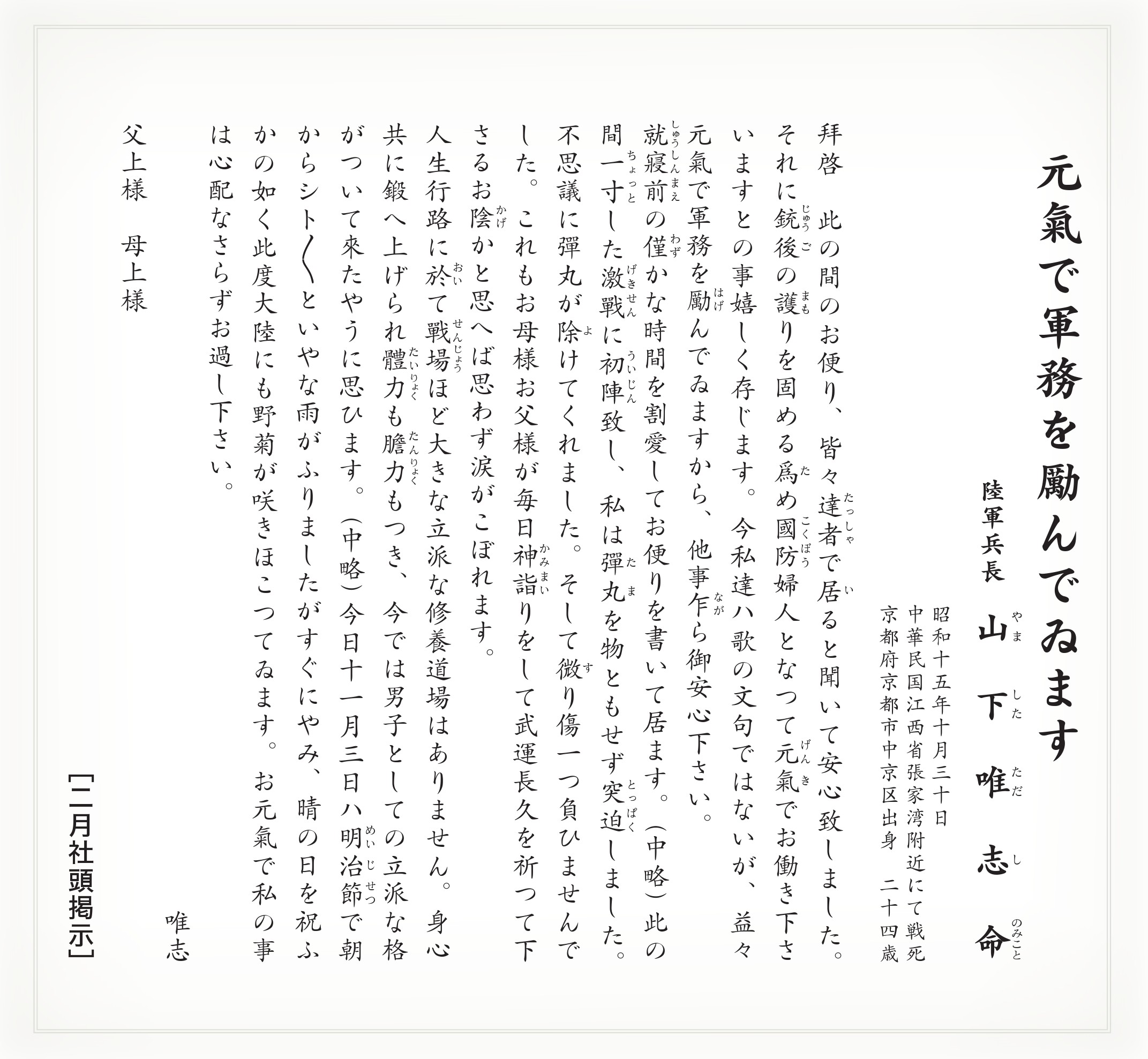 靖國神社では、多くの方々に、祖国のために尊い一命を捧げられた英霊のみこころに触れていただきたいと、英霊の遺書や書簡を毎月、社頭に掲示しています。