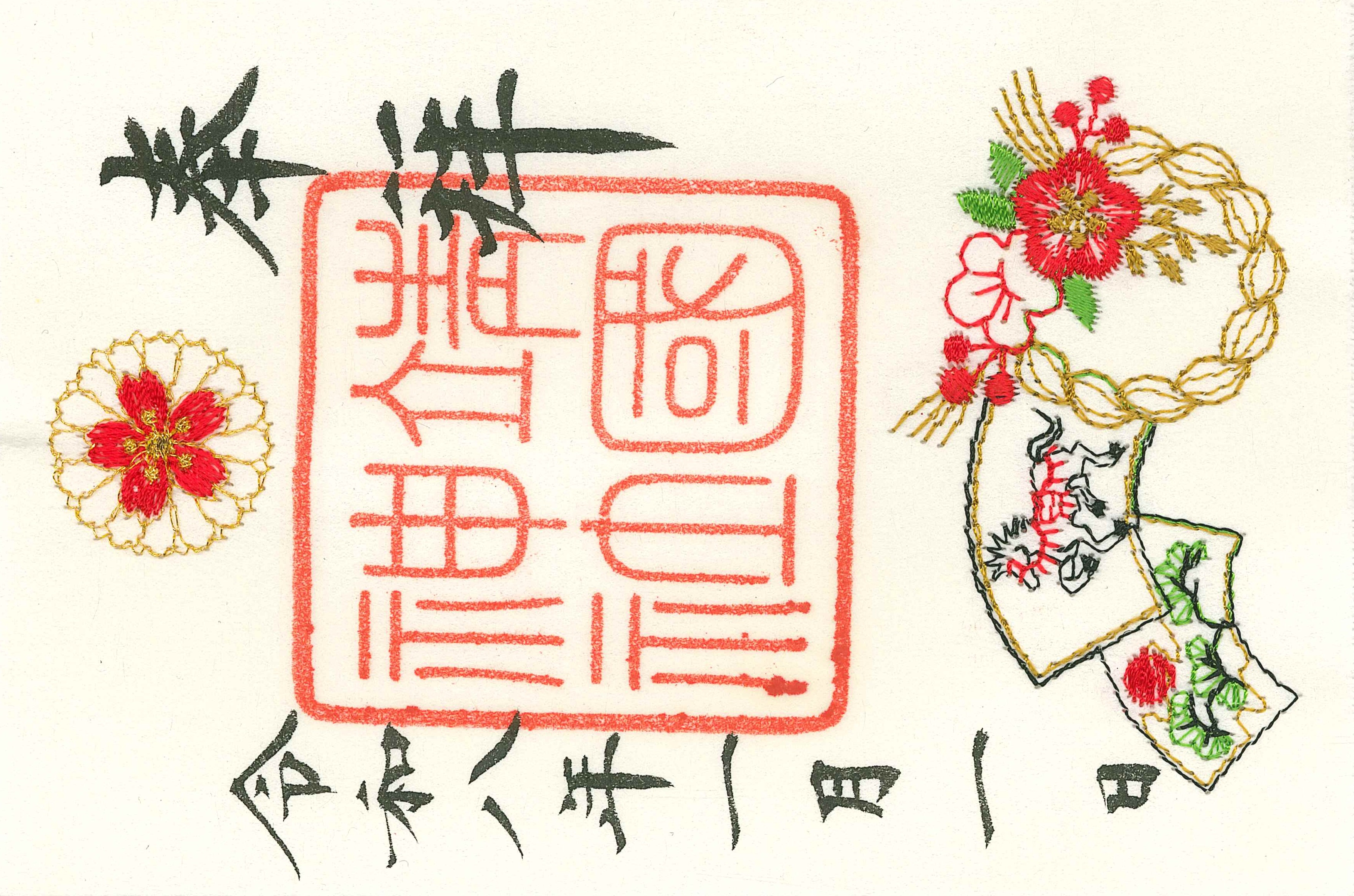 美濃和紙に干支の扇絵と注連飾、社紋を刺繍した朱印用紙です。