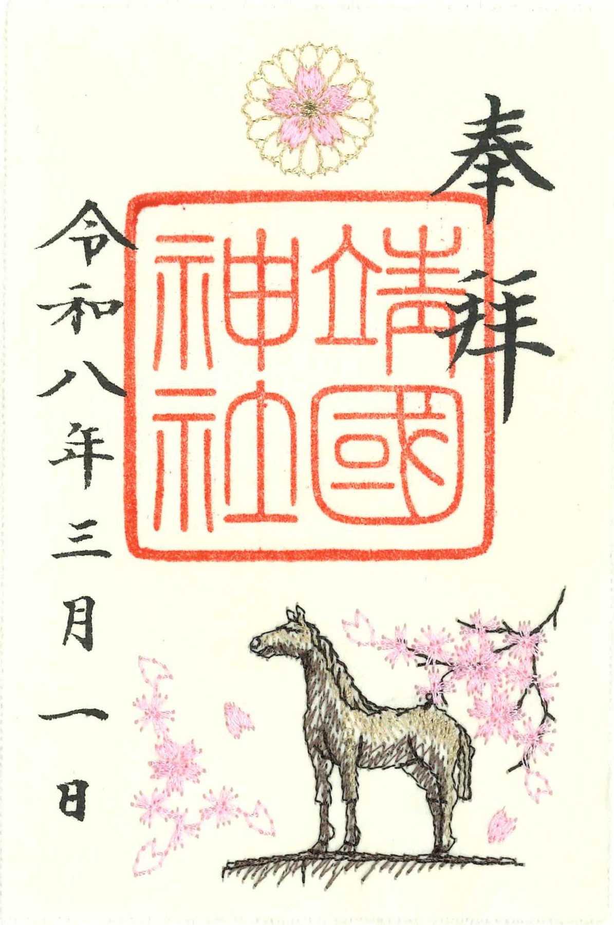 美濃和紙に社紋、境内の馬像に桜の花びらが舞う様子を刺繍した朱印用紙です。