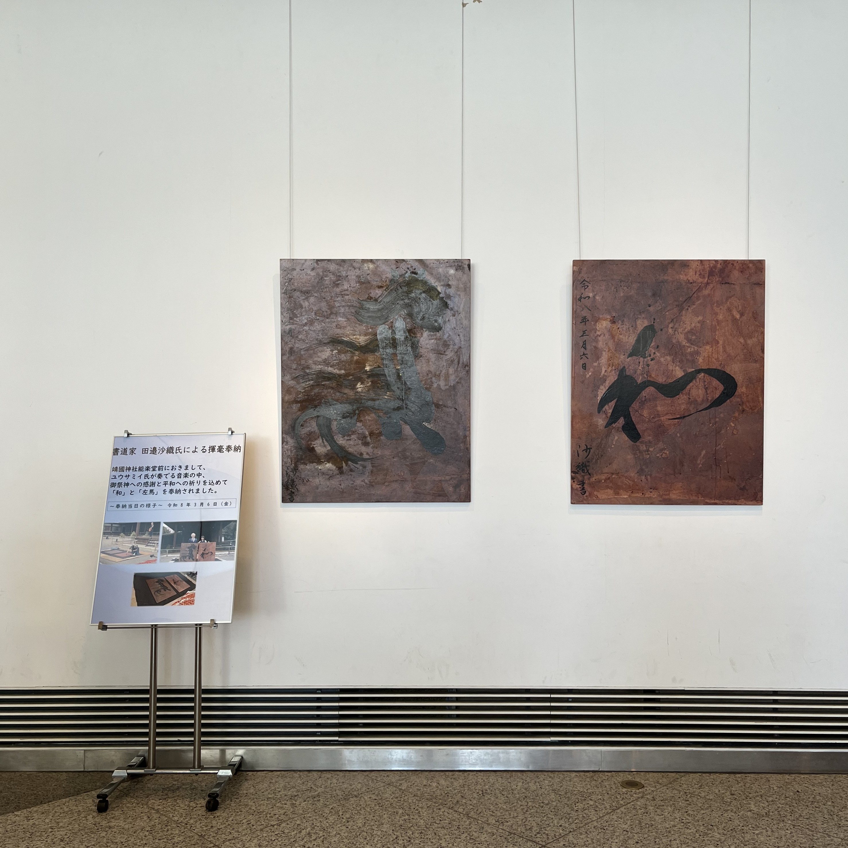 3月6日(金)靖國神社能楽堂前におきまして、ユウサミイ氏が奏でる音楽の中、御祭神への感謝と平和の祈りを込めて「和」と「左馬」の揮毫が奉納されましたので、遊就館にて展示いたします。